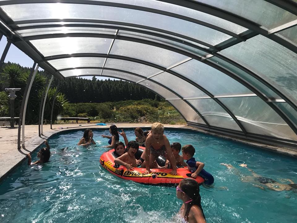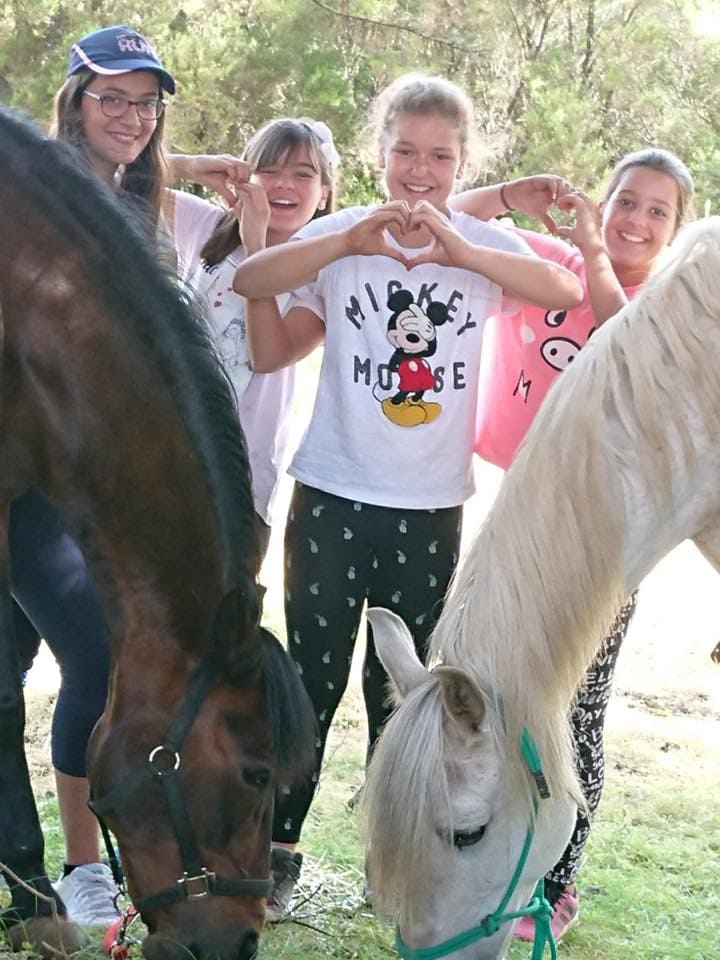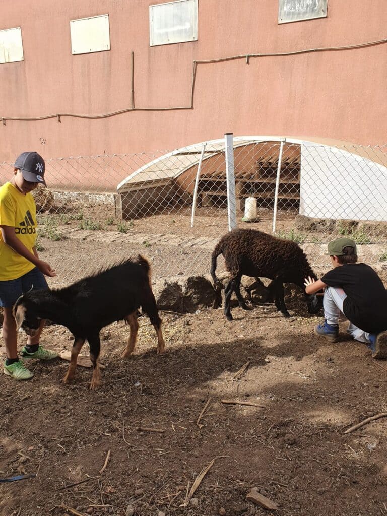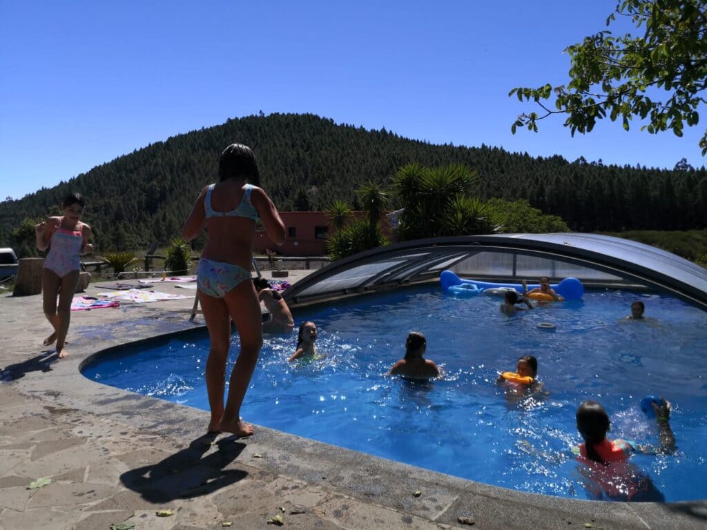 Dispone asimismo de salón de juegos y televisión, porche cerrado provisto de mesas y sillas para los talleres y manualidades y piscina climatizada. La granja cuenta con caballos, una vaca, dos cochinos adultos y tres crías, ovejas y dos perras, sin contar con una amplia red de senderos para la realización de las actividades y paseos dentro de la propia finca.